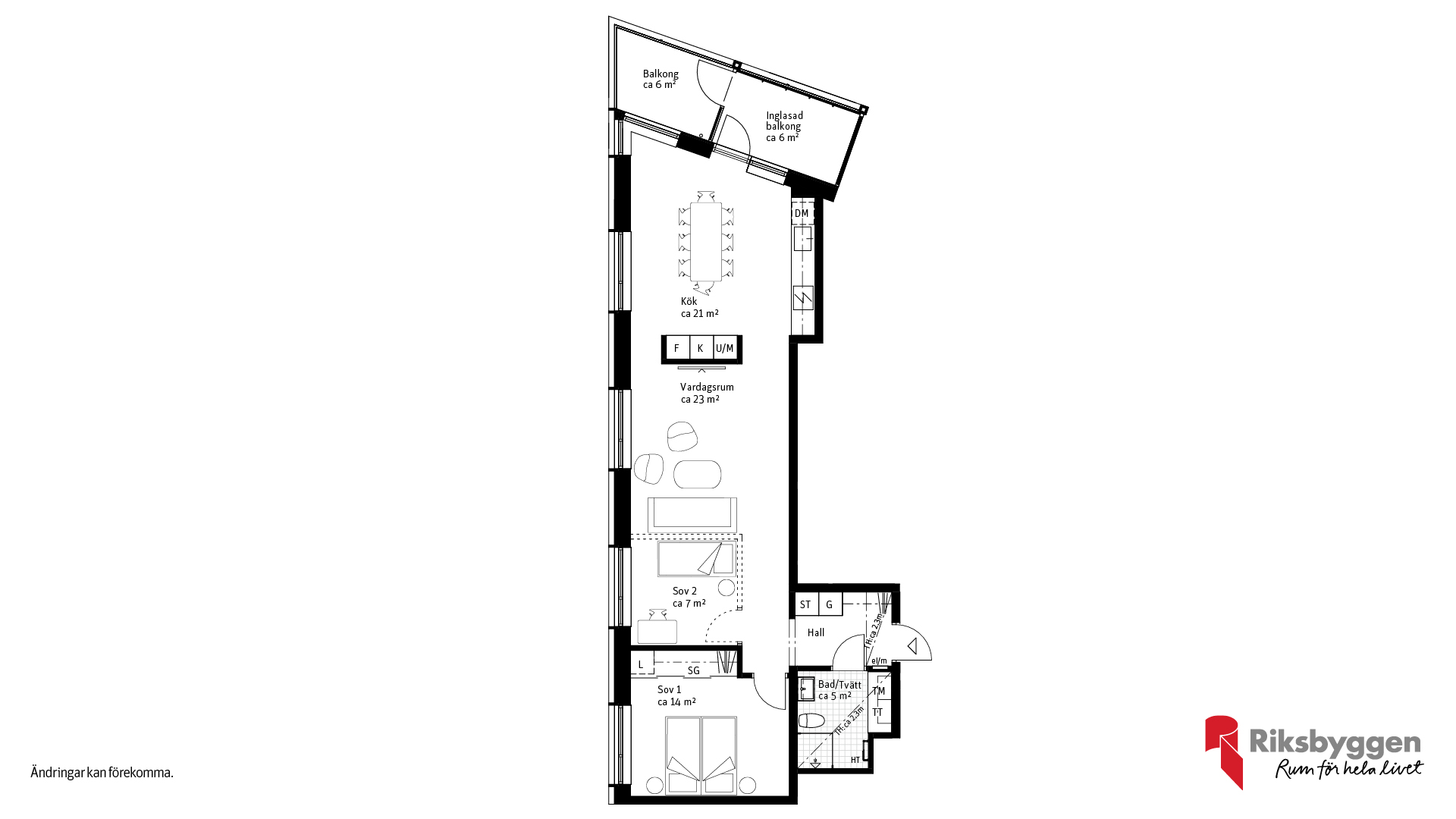 En modern 3 rok om 79 kvm på våning sex. Ett hem där varje kvadratmeter är genomtänkt. Den öppna planlösningen mellan kök och vardagsrum skapar en luftig social yta på generösa kvadrat. Från köket nås dessutom både en inglasad balkong och en öppen balkong, två härliga uteplatser för alla årets stunder. Två sovrum. Möjlighet finns att göra ett frånval av sovrum 2 och istället skapa ett ännu rymligare vardagsrum. Funktionellt badrum med tvättmöjligheter.