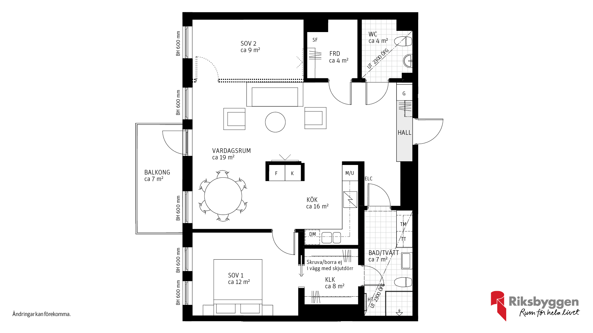 En rymlig trea på våning sex med balkong i väster. Vardagsrum och kök i öppen planlösning med plats för matgrupp. Sovrum 1 med ingång till klädkammare med ingång till badrum. Badrummet nås även från hallen där det finns avhängning och garderob. Gästtoalett. Förråd om ca 4 kvm Sovrum 2.
