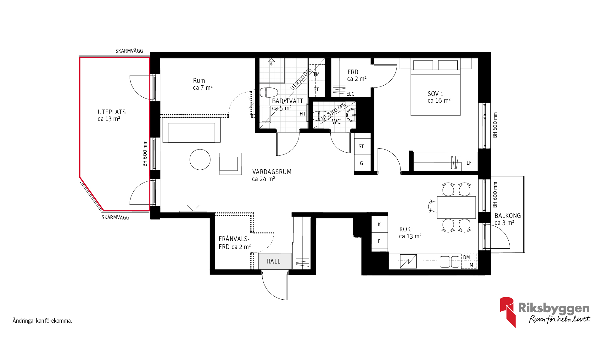 En trivsam trea med rymlig uteplats och balkong. Denna trea kan också bli en rymlig två med ett frånval av sovrum 2 tillförmån för ett större vardagsrum. Kök med plats för matgrupp och utgång till balkong. Sovrum 1 med skjutdörrsgarderob och förråd. Sovrum 2 inåt gården. Ett rymligt badrum med tvättmöjligheter samt en mindre gästtoalett. I hallen finns det en skjutdörrsgarderob och ett förråd som det finns möjlighet att göra frånval till förmån för en större hall.