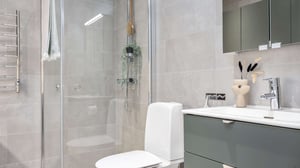 Badrummet är lika omsorgsfullt utformat, med kakel och klinker som matchar kökets färg- och materialval. Resultatet är ett enhetligt, lugnt och elegant intryck i hela bostaden.