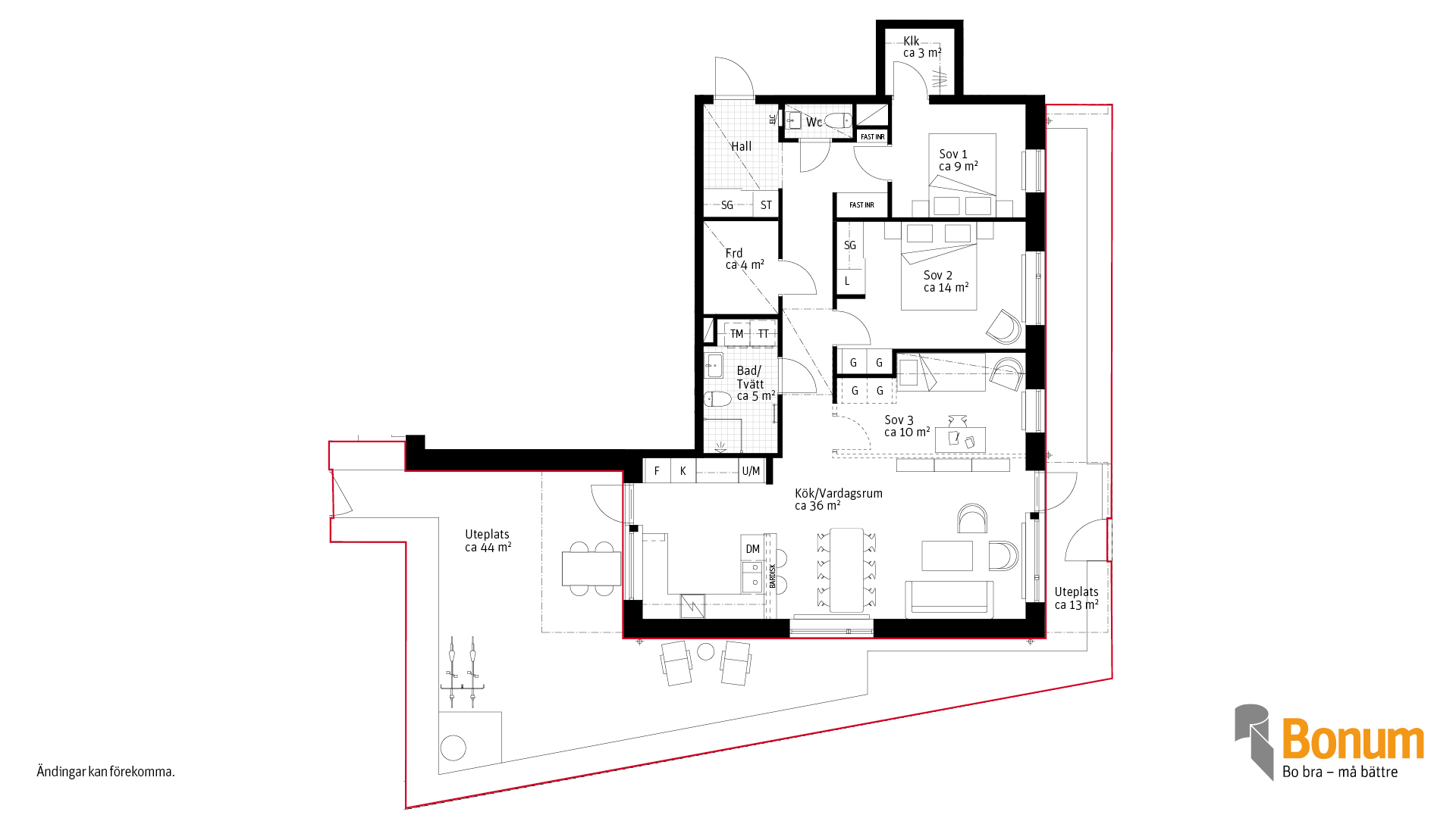 Stor lägenhet med uteplats i sydväst! Här får du ett hem med rymd och frihet - hela 102 m² och en uteplats som sträcker sig runt större delen av lägenheten, varav den största delen i soligt sydvästläge. Perfekt för långa sommarkvällar och sociala stunder utomhus. Lägenheten har ett öppet kök/vardagsrum, stort badrum med tvättmöjligheter, gäst-WC och förråd i hallen. Tre sovrum kan bli två för dig som hellre vill ha extra kvadratmetrar i vardagsrummet. Brf Lyckø - flexibilitet för din livsstil.