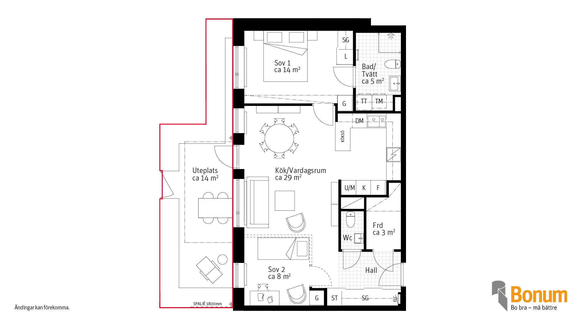 Rymlig trea med uteplats i västerläge! Bo bekvämt på markplan med en härlig uteplats om ca 14 m² mot den gröna innergården - perfekt för soliga eftermiddagar och kvällar. Lägenheten har två sovrum, ett öppet kök/vardagsrum och badrum med tvättmöjligheter. Planlösningen är flexibel - gör om till en rymlig tvåa med större vardagsrum om du önskar Här finns också en gäst-Wc. Bonum Brf Lyckø erbjuder ett modernt och tryggt boende nära havet, naturen och service.