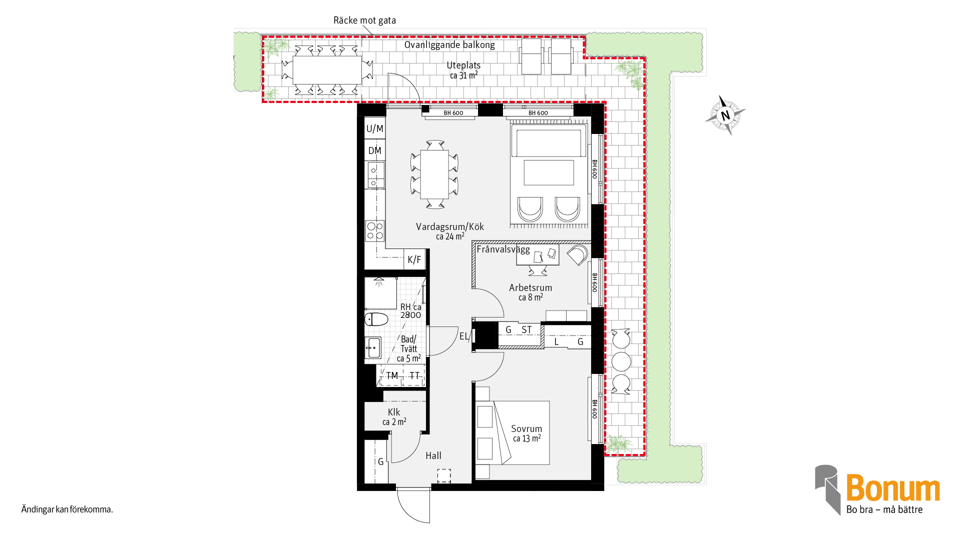Gavellägenhet med fönster i två väderstreck, 3 rum och kök om ca 66 kvm. Lägenheten ligger i markplan med uteplats runt hela lägenheten, Kök och vardagsrum i öppen planlösning med utgång till uteplatsen. Vill du ha ett större kök/vardagsrum går det att välja bort arbetsrummet. Du förvarar dina saker i skjutdörsgarderober samt en klädkammare. I badrummet finns torktumlare och tvättmaskin.