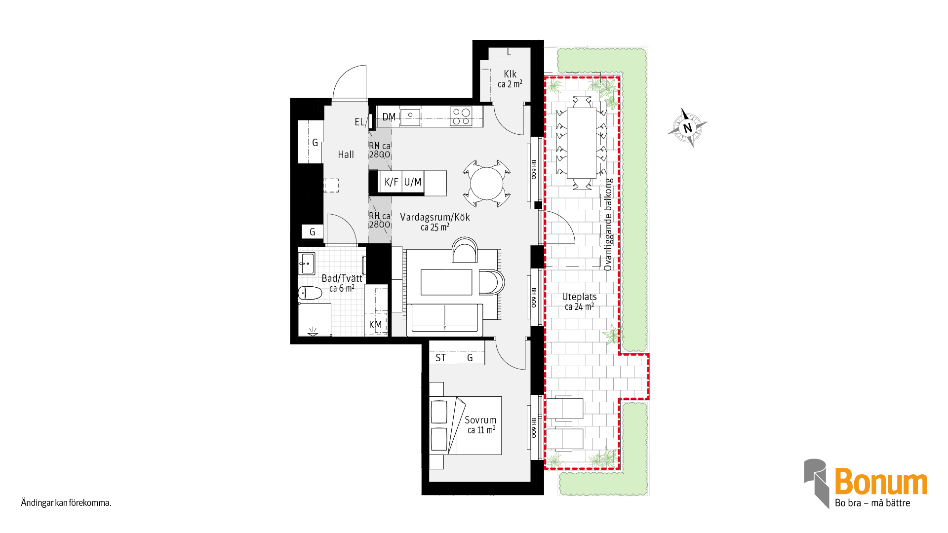 Marklägenhet med uteplats utmed hela lägenheten. 2 rum och kök om ca 52 kvm. Kök och vardagsrum i öppen planlösning men köket är delvis avskilt från vardagsrummet. Du förvarar dina saker i skjutdörrsgarederob samt en klädkammare. I badrummet finns tvättutrustning. Lägenheten vetter mot den gemensamma gården.