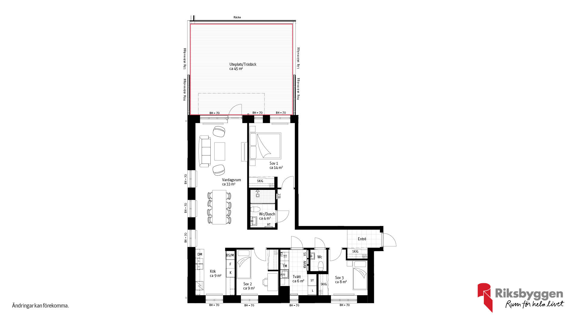 4 rum och kök i markplan med en uteplats som mäter hela 45 kvm i lugnt sydväst läge. Öppen och luftig planlösning med dagsljus från tre väderstreck. Badrum med stort duschutrymme i nära anslutning till det stora sovrummet. Det stora sovrummet, liksom de två andra har inbyggda skjutdörrsgarderober för bra förvaring. Separat tvättstuga så du slipper ha eventuellt stök i sikte. Här finns såklart både tvättmaskin, torktumlare och förvaringsmöjligheter.