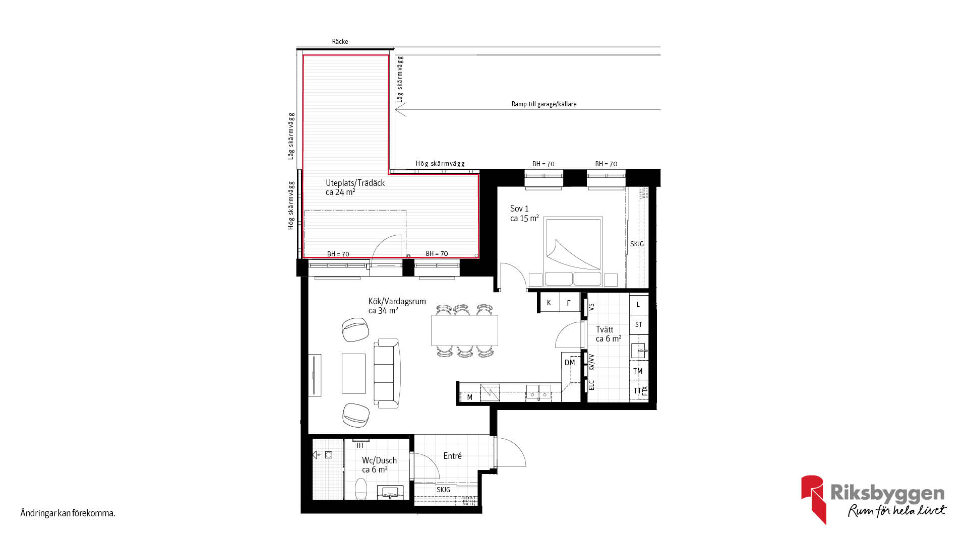 2 rum och kök i markplan med stort trädäck/uteplats i sydvästläge. Öppen och luftig planlösning och separat tvättstuga.