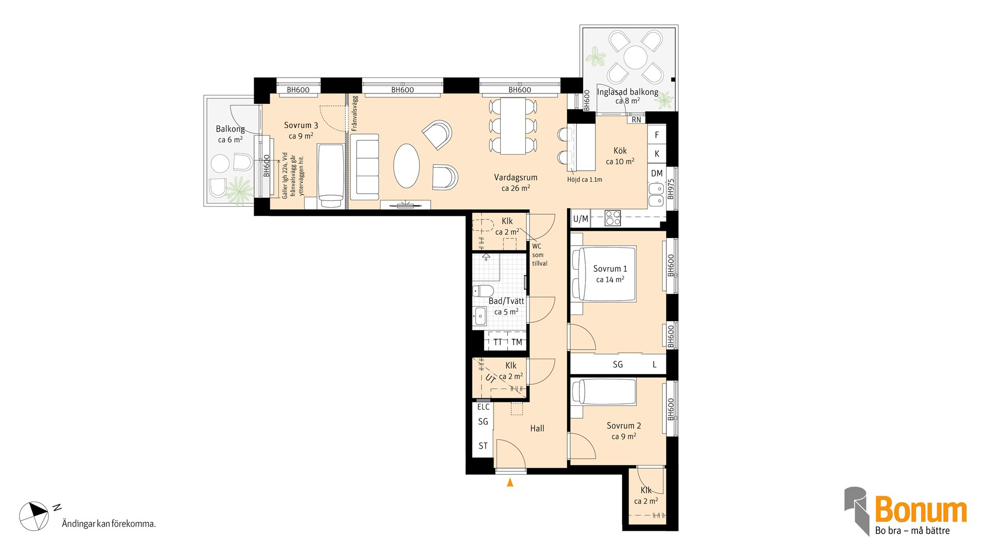 Charmig fyra med rummen i vinkel och med två balkonger. Det generösa vardagsrummet, med öppning mot köket, skapar en naturlig mötesplats för familjen. Vardagsrummet har direkt utgång till den stora inglasade balkongen - perfekt för både varma sommardagar och kyliga höstkvällar. Köket är praktiskt utformat med moderna vitvaror inklusive diskmaskin och integrerad mikro och ugn. Förvaringsutrymmena är genomtänkta med två klädkammare och inbyggda garderober. Badrummet är funktionellt inrett med duschhörna, tvättmaskin och torktumlare.