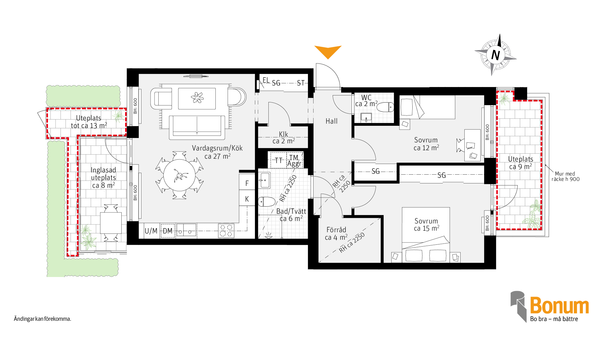 Marklägenhet i öster-/västerläge med två uteplatser. Njut av morgonsolen på den ena, och eftermiddagssolen på den andra. Bra planlösning med privat sovrumsdel och gott om förvaring.