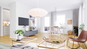 Stilren och tidlös design med ljusa färger och vackert parkettgolv. Och om du önskar kan du kan sätta din personliga prägel genom olika tillval. Köken är moderna med rostfria vitvaror, integrerad diskmaskin och induktionshäll. Badrummen är helkaklade med tvättutrustning, tvättmaskin och torktumlare i större lägenheter, kombimaskin i mindre.