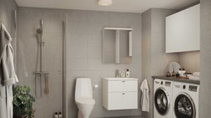 Vägghängd kommod från Svedbergs med lådor och tvättställ. Spegelskåp med belysning. Tvättställsblandare i krom.